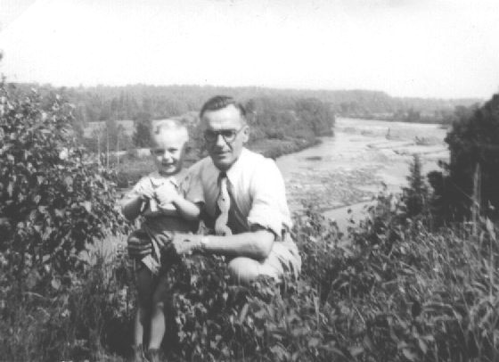 Émile Borgia et son fils Léo au-dessus de la rivière Sainte-Anne, derrière la maison d'Octave Borgia