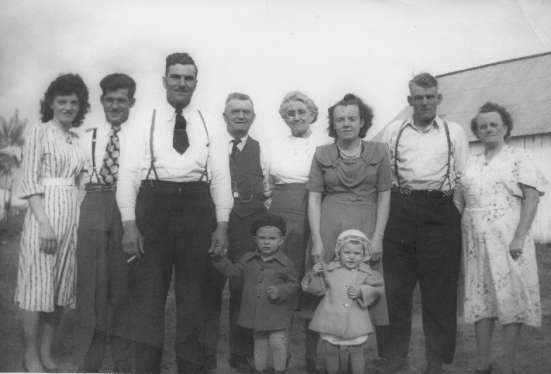 Marie-Ange Cayer, Gérard Paquet, Gaston Boucher, Arthur Germain, Démerise Ricard, Adélisca Cayer, Georges Édouard Cayer, Albertine Germain, Henri-Paul Boucher et Lisette Boucher vers 1949