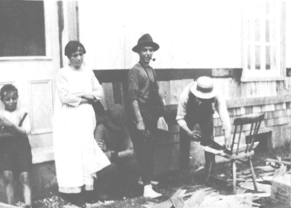 Lucien Borgia, Sophie Benoît, Émilie Borgia, assis, et Léo Borgia qui travaille avec son père Octave à la construction de la maison.
