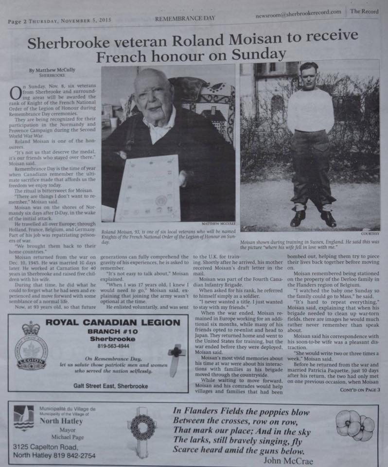 Aricle du journal Sherbrooke Record du 5 novembre sur l'honneur qui sera fait à Roland Moisan le 8 novembre 2015