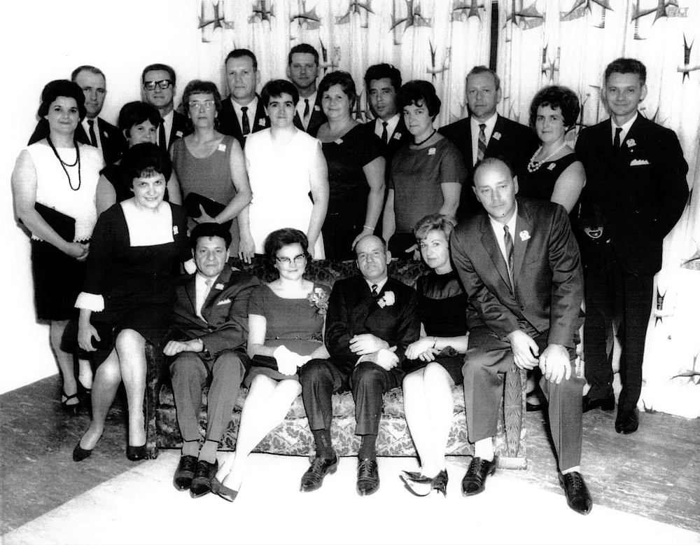 Sur le divan, de gauche à droite: Yvonne Hardy, Louis-Philippe Borgia, Noéma Borgia, Maurice Rochette, Aline Borgia et Gérard Maheu. Deuxième rangée,de gauche à droite: Denise Borgia, Lucette Gauvin, Thérèse Julien, Rita Corriveau, Gilberte Borgia, Jacqueline Déry, Florida Genois. Troisième rangée, de gauche à droite: Omer Voyer, Fernando Borgia, Jean-Charles Borgia, Camilien Borgia, Jacquelin Paquet, Maxilien Borgia et Gratien Borgia. Photo prise en juin 1966 lors du 25e anniversaire de mariage de Noéma Borgia et Maurice Rochette.