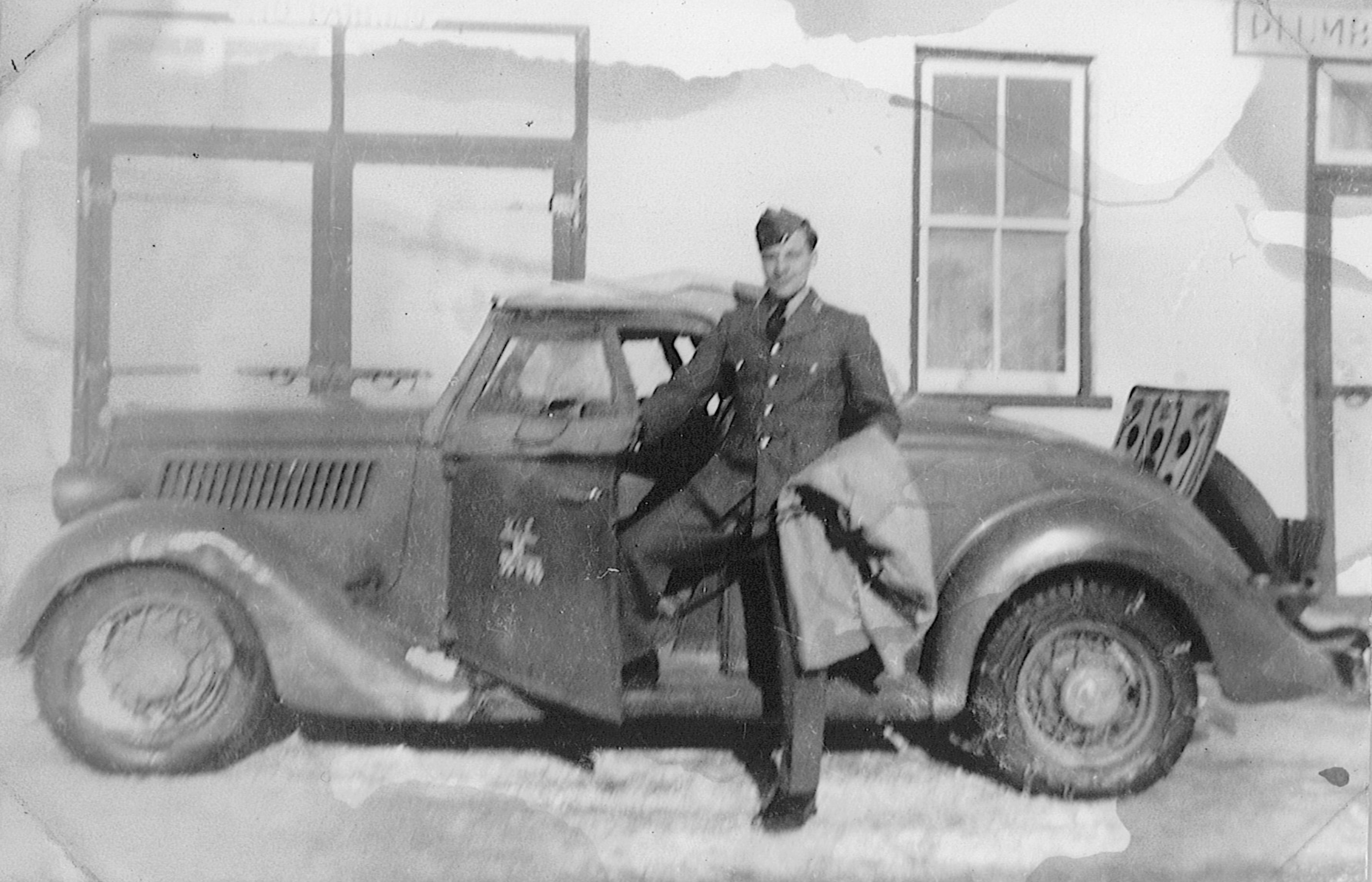 Louis-Philippe en habit de soldat ouvrant la portière d'une auto