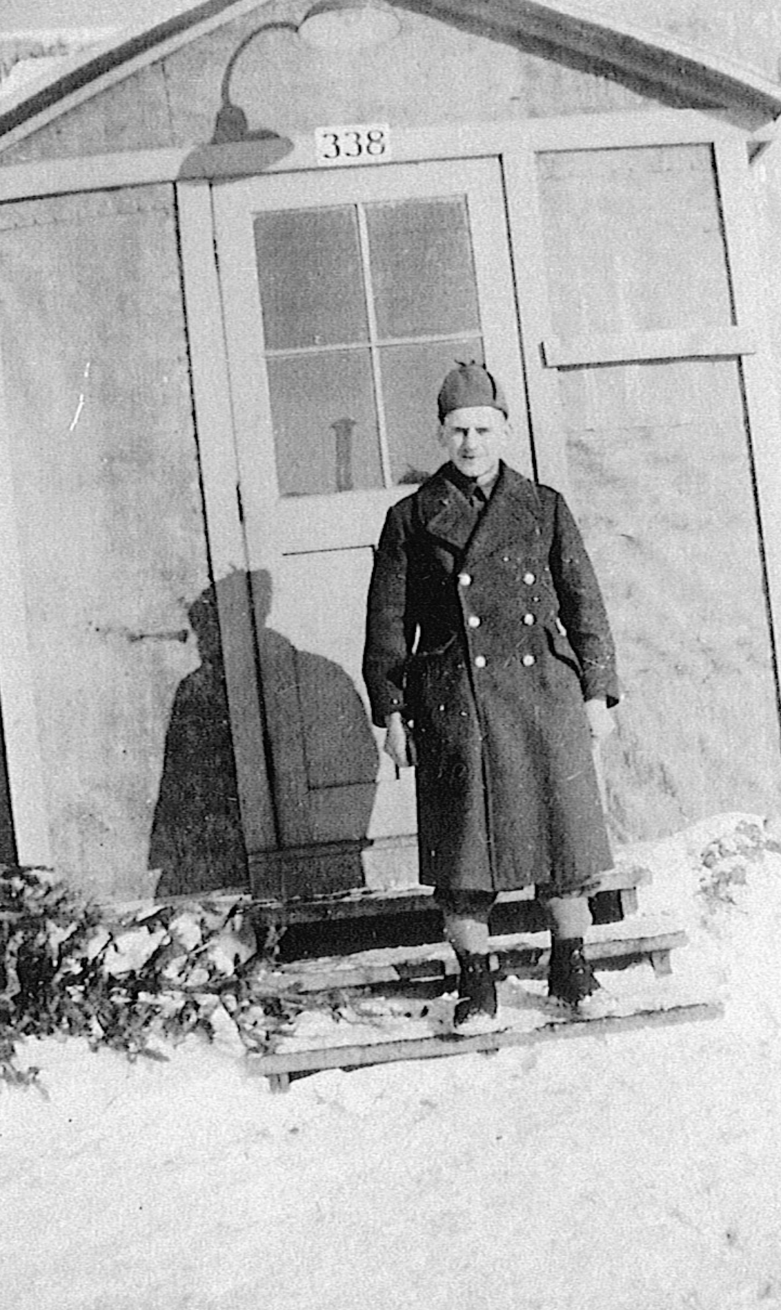 Marcel Borgia devant la porte d'une baraque militaire