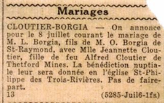 Coupure de presse annonçant le mariage de Ludger Borgia et Jeannette Cloutier